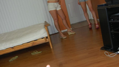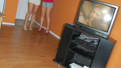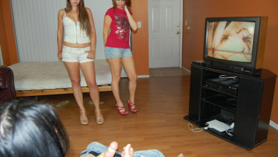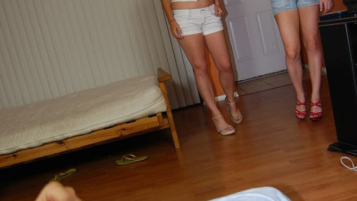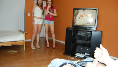 Audrey walks in on her boyfriend Jay masturbating. Audrey scolds her man, and it totally embarrassed as her friend Zoe is with her too. Zoe tells Audrey its ok and not to be embarrassed. Audrey continues to yell at Jay when he wont stop jerking it. She decides to have some fun since he wont stop, and invites Zoe to watch while she makes him jizz. When Zoe gets into it, they both get splattered as his cock explodes on both of them.