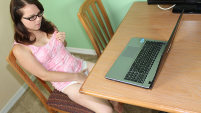A girl's gotta make money and if that girl is a webcam model, she can't make money if her computer isn't acting right. This is the exact predicament Jennifer Bliss finds herself in halfway through her cam show so she hits up her local geek squad dude who comes right over to her rescue. The naughty brunette teen is horny as fuck and can't resist flirting with him and even though he doesn't flirt back while he works.