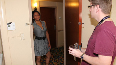 Sexy black milf Rihanna suddenly finds out Ben is in one of the rooms. Rihanna decides to grab the chance and do what she can't do at home, so she takes his clothes off and starts sucking his big cock. Ben is amazed by her blowjob skills, and enjoys every moment of this cock treatment.