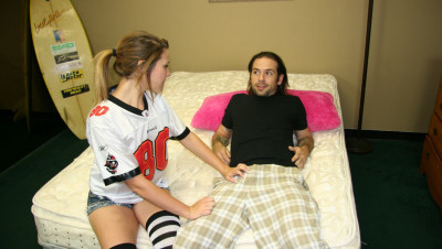 Teen Claire Heart loves her some football. She makes a bet with Charlie, if her team loses he gets a tug job. When she looses the bet, Charlie whips out his dick and proceeds to get a nice jerk job. When he finally busts his nut, Claire yells touch down, as his dick dribbles out cum.