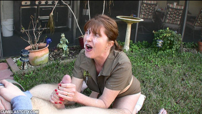 Billy is interrupted from masturbating when the delivery woman Dee delivers a package. When she spots him jacking his rod, the horny milf notices he is doing it all wrong and decides to help him out by giving him a handjob until she is splattered with cum.
