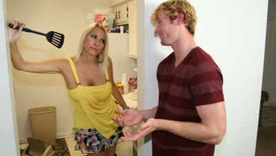 When Mom next door Dallas invites Joey over for dinner, the young kid is running a little late. But Dallas is furious and decides to teach him a lesson he wont soon forget. The mom lathers his cock up with cooking oil and jerks him off all over her face.