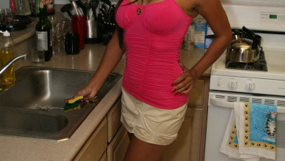 Mrs. Astoria's hubby is out of town again. She calls up her neighbor Johnny to give her a hand in the kitchen. When Johnny arrives, he notices Mrs. Astoria a little hot. He takes full advantage of the situation by coaxing her to stroke his big boner.