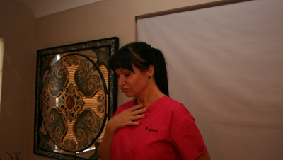 Angie just got a new job as a massage therapist when she meets Segio, the hunky new guy in town. Things go smooth until she notices his monster cock protruding through his shorts. When she tempts him, he gets even more aroused. Finally the horny milf strokes him off with a happy ending.