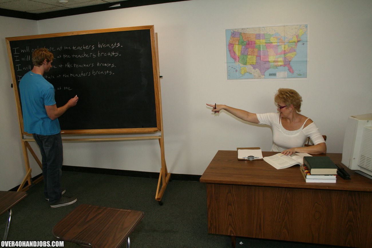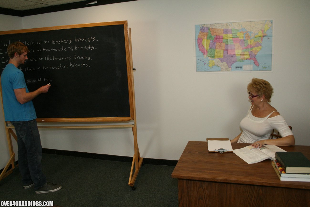 Young Jonny has misbehaved in class again, this time staring at Mrs. Tracy's gigantic juggs. The perverted teacher makes him write on the board, but when this punishemnt doesnt work, the jerks his cock only to bring him to the brink of orgasm them slapping him on the head.