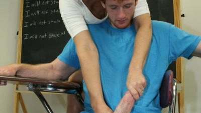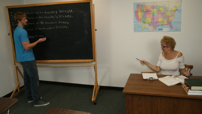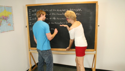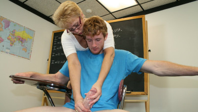 Young Jonny has misbehaved in class again, this time staring at Mrs. Tracy's gigantic juggs. The perverted teacher makes him write on the board, but when this punishemnt doesnt work, the jerks his cock only to bring him to the brink of orgasm them slapping him on the head.