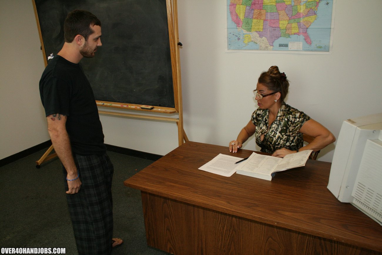 When Billy oversleeps and arrives to class in his pj's, he gets scolded by his bossy and busty school teacher Mrs. Stacie Starr. She humiliates him, pulls down his pants and beats his big cock while whipping out her massive juggs and making him to bust is nut in front of everyone.