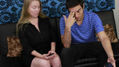 Billy accidentally sends his busty step mom Desiree Deluca a text message photo of his huge-sized boner. The slutty over 40 milf seems to like what she saw, after all, his dick is massive. She asks him to stroke his dick so she can watch, eventually she gives in and makes his dick erupt with a monster sized cum spurt by jerking him off good.