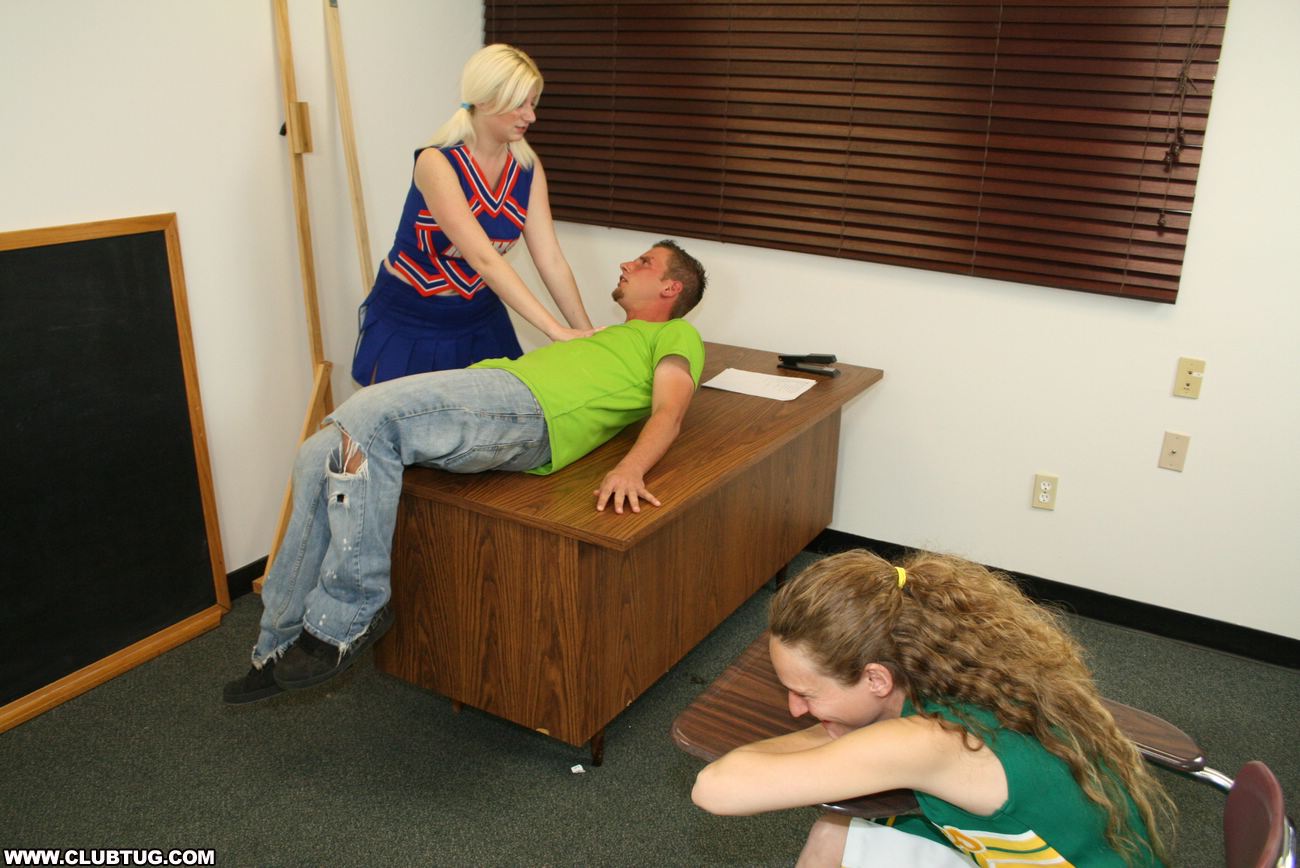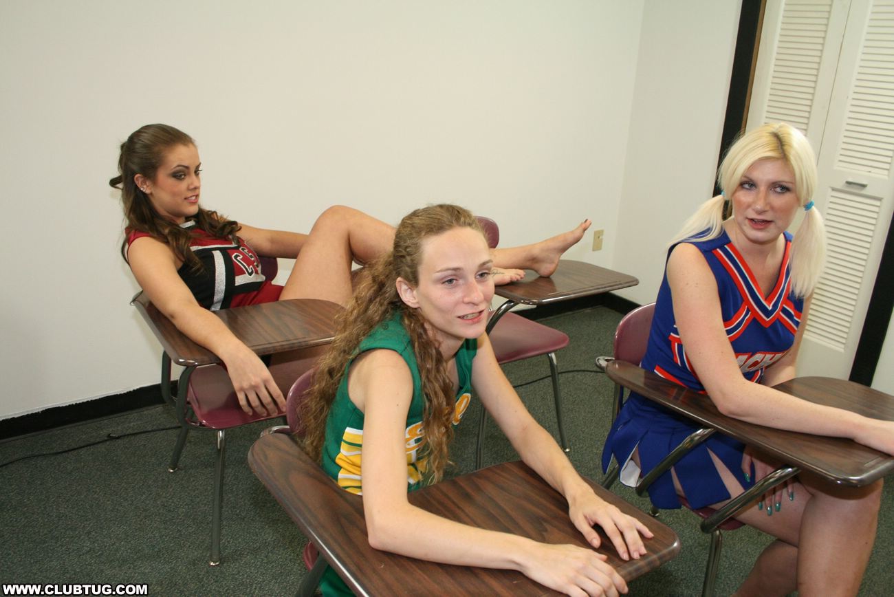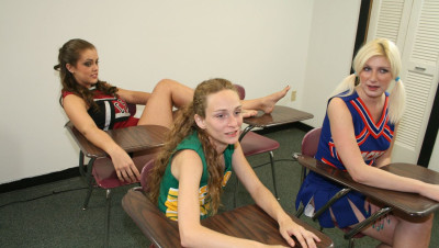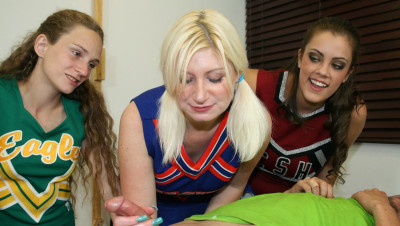 Bratty cheerleaders Barbi Katie and Hailey love a little competition. When they spot Johnny they decide to have a little competition, to see if they can make him spurt. The three sluts milk his cock dry while they cheer each other on.