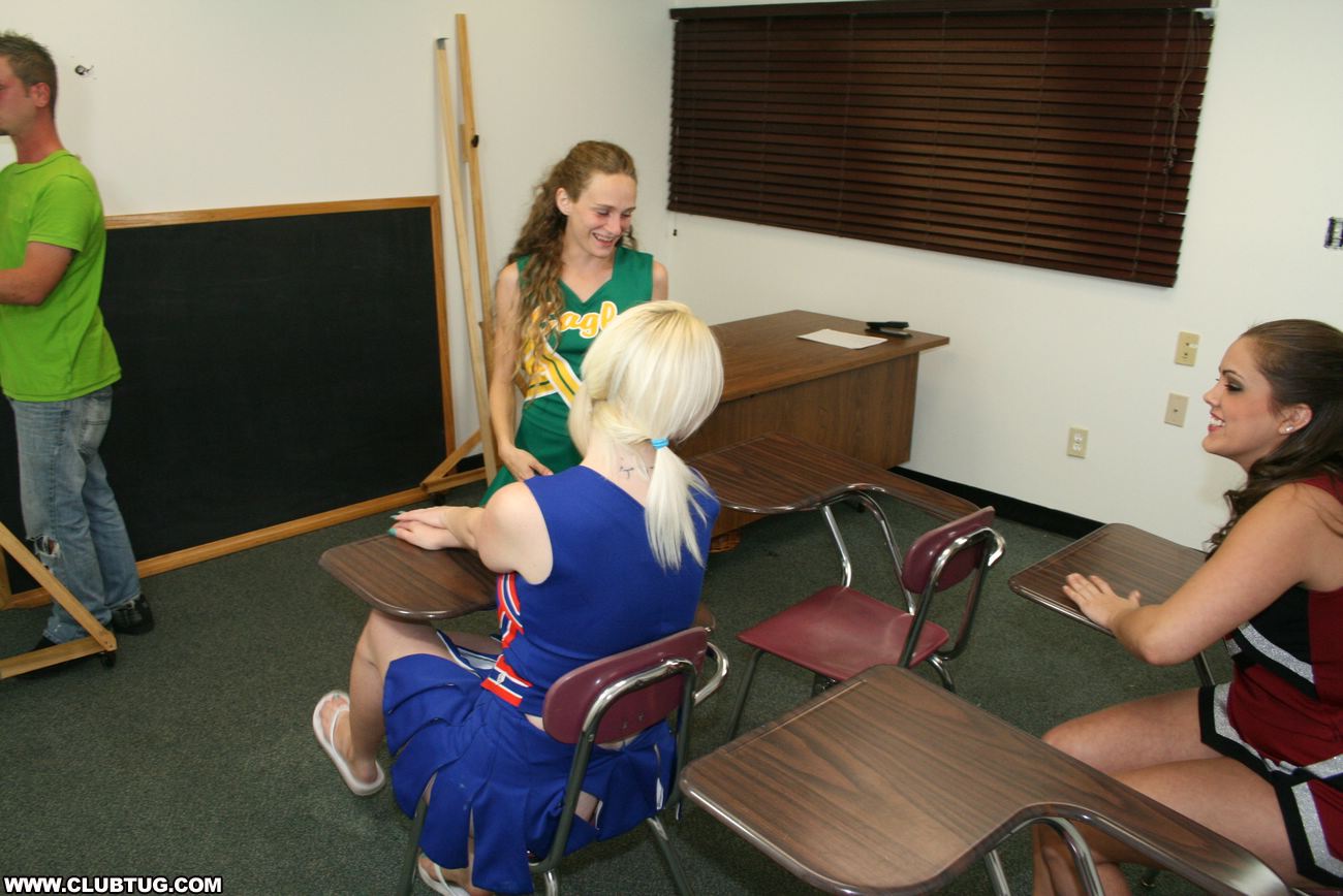 Bratty cheerleaders Barbi Katie and Hailey love a little competition. When they spot Johnny they decide to have a little competition, to see if they can make him spurt. The three sluts milk his cock dry while they cheer each other on.