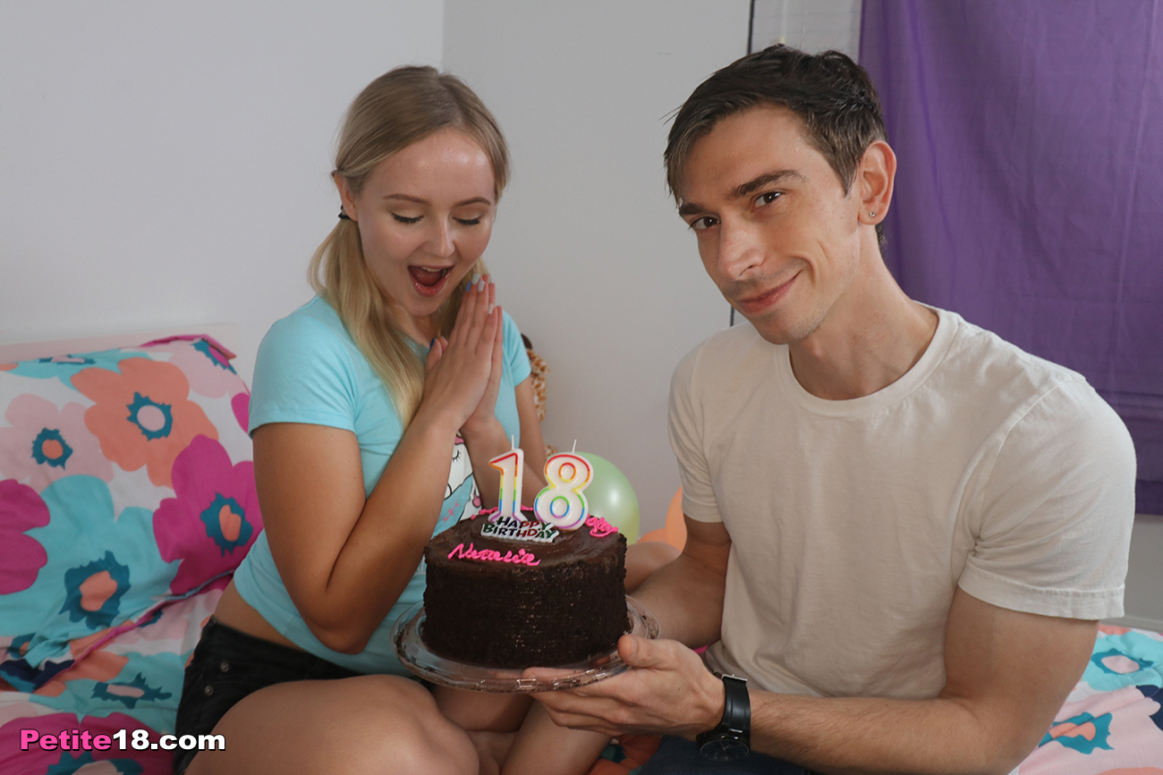 Super cute teen Natalia Queen turns 18 today and gets really surprised when her step-brother comes in with a birthday cake. The best news is that now she can have sex with him and she won't miss the chance! First, the beautiful blonde babe grabs that dude's dick and sucks it big time and then he fucks her tight pussy for good before exploding with cum in her cute face.