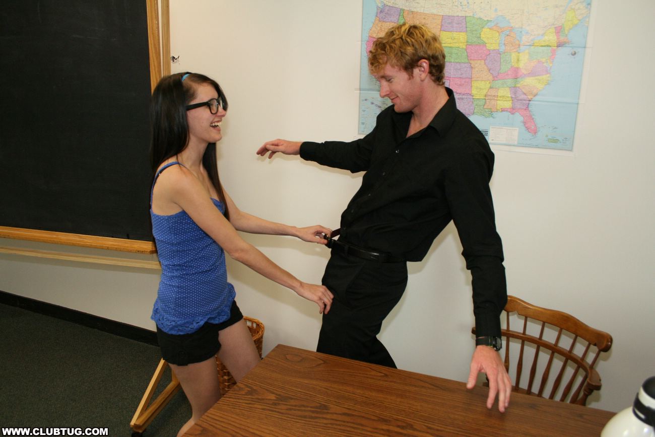 Four eyed nerd Kaci gets busted in detention and begs Mr. Johnson to show her his large cock. The innocent teen gets turned on by the sight, and starts milking him off. Mr. Johnson 's throbbing cock nuts hard, but gets nervous afterwards. She explains to mr. Johnson to not worry, its "our little secret".