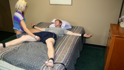 Roberta's daughter seduced her boyfriend in the bedroom. Her daughter strap his boyfriend's hand and feet then she called her mom Roberta to sucks her boyfriend's cock