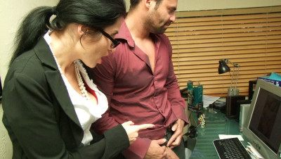 Frank is caught red handed when he gets interrupted whilst jerking off to some sexy pics he found of the two hot office secretaries Tatiana and Persia. The two milfs scold him and yell him, until they see how large his dick is. They decide to help him bust his nut all over the computer screen by sucking and jerking him off together.