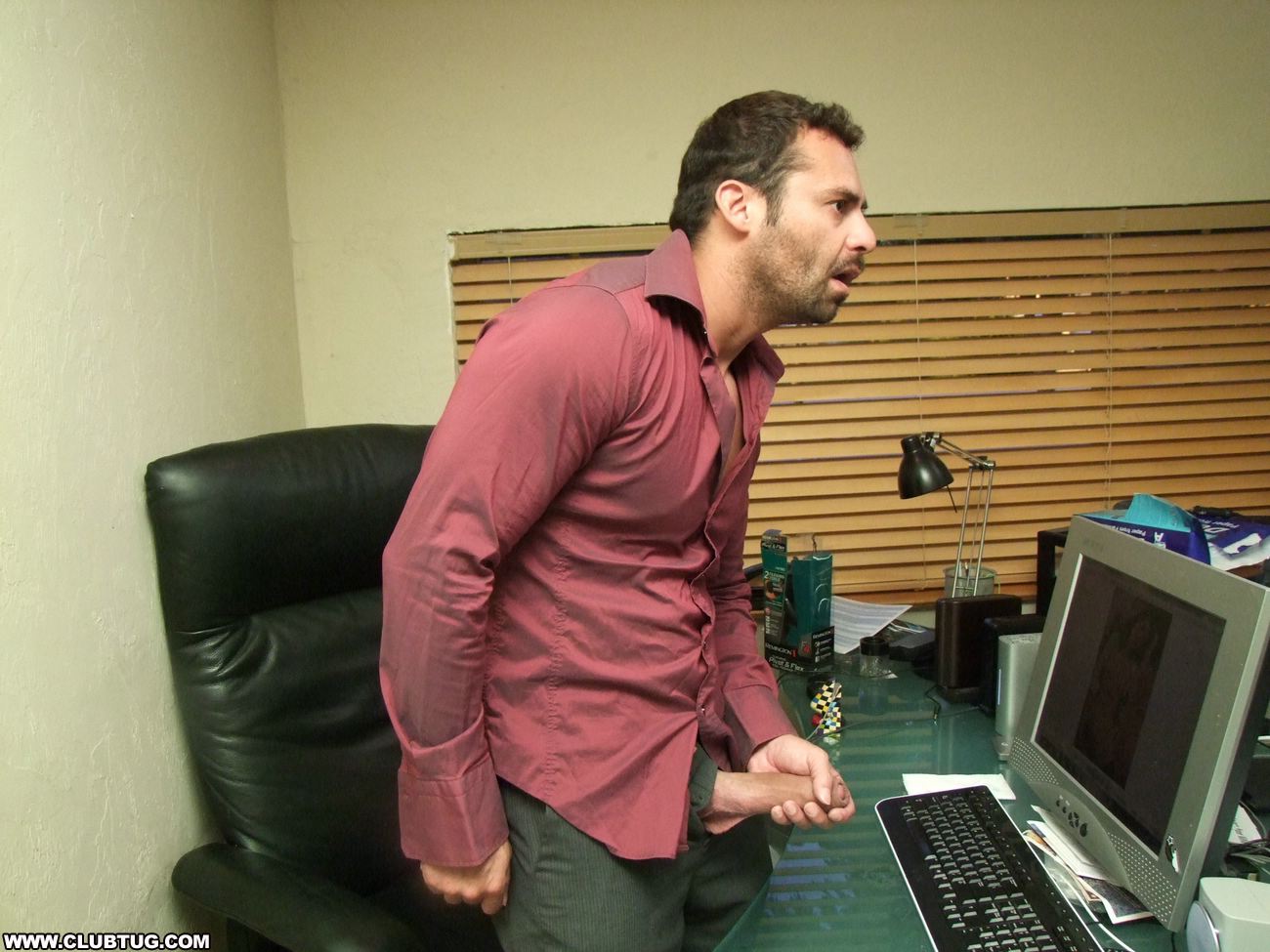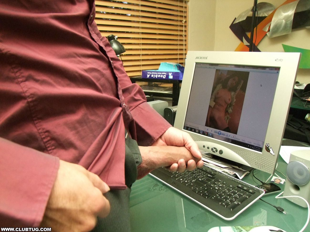 Frank is caught red handed when he gets interrupted whilst jerking off to some sexy pics he found of the two hot office secretaries Tatiana and Persia. The two milfs scold him and yell him, until they see how large his dick is. They decide to help him bust his nut all over the computer screen by sucking and jerking him off together.