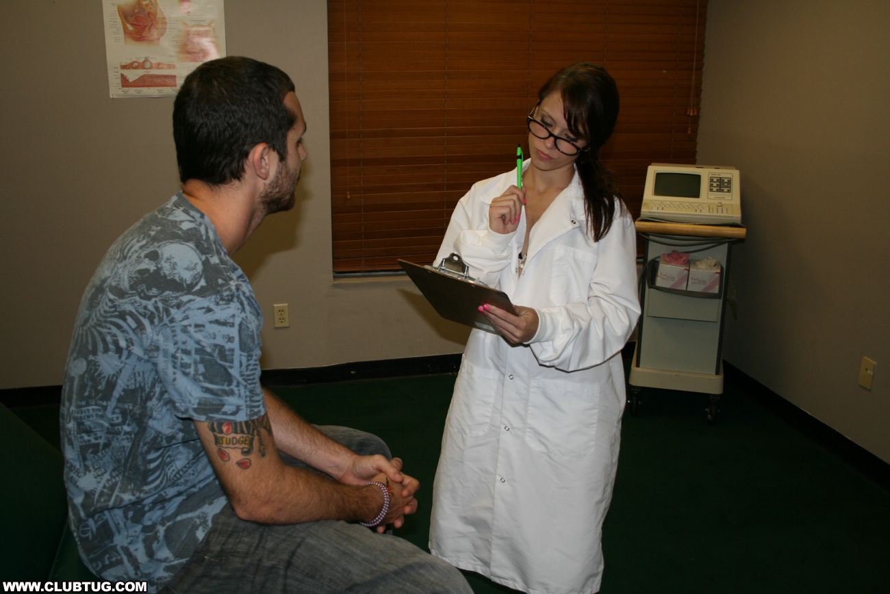 Poor Joey is having a problem "down there", and he needs to get it checked out. Lucky for him sexy nurse Jenna is there to relive his pain. She whips on her latex gloves and instinctively tugs away at his large dick, making him spurt out a nice big semen sample for testing.