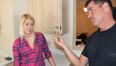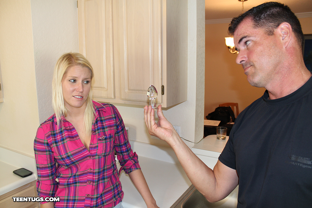 Petite blonde teen Vanessa Cage finds her butt plug inserted inside her pipes. So she calls the handy man. He is shocked at the sight, and teen Vanessa is embarrassed. He coaxes her to take off her top, and he whips out his cock while she jerks and milks him off.