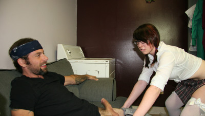 Horny college student Dakota Charms coaxes cum from some stranger in the laundry room. The slutty teen girl makes him to sit down and dominates his dick by jerking it hard until he squirts his semen.