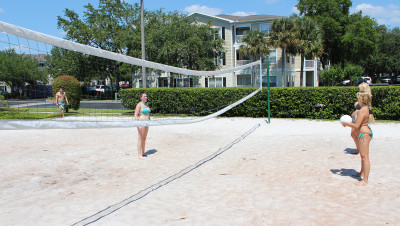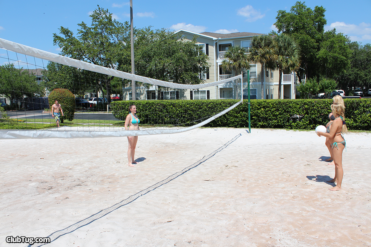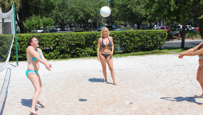 Amber Bach, Charlee Chase and Melanie Hicks are playing beach volleyball when Scott shows up the horny girls call him to play with them. They take him to their room and place him on the bed, before starting to jerk off his dick. The busty girls tag team this dick until Scott explodes his cumload on their big tits.