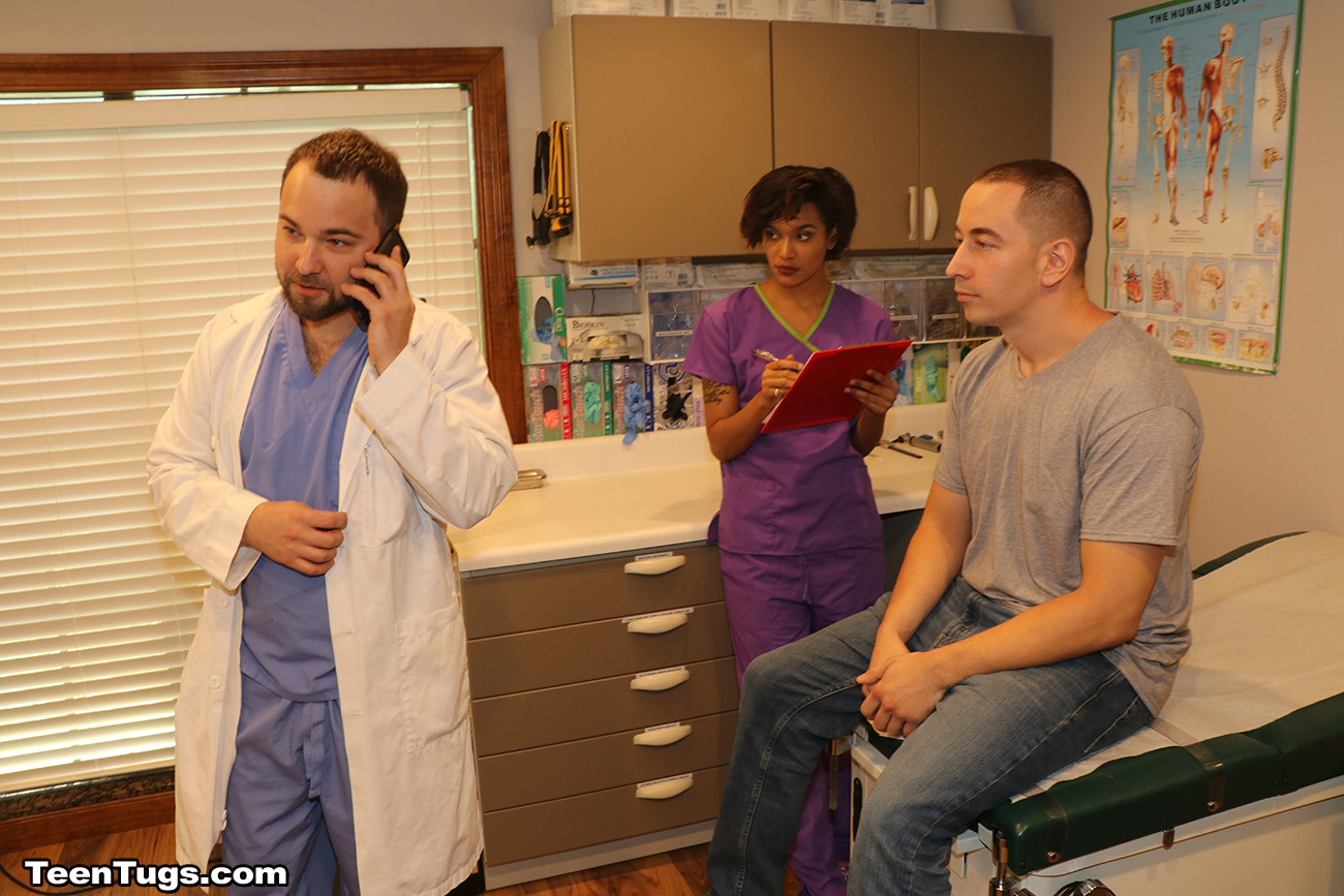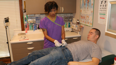 John is in for his exam when the doc steps our for an emergency. Luckily Nurse Barnes is available to extract the needed samples. She pulls out his hard cock and milks him with latex gloves, stroking his hard cock until he accidentally explodes his semen, shooting his goo over his shirt. Nurse Jasmine believes shes has enough for a sample.