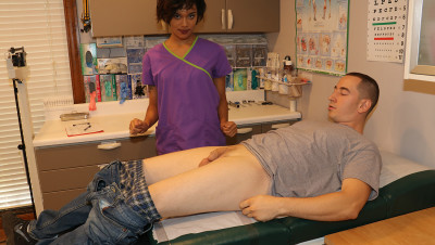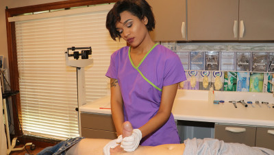 John is in for his exam when the doc steps our for an emergency. Luckily Nurse Barnes is available to extract the needed samples. She pulls out his hard cock and milks him with latex gloves, stroking his hard cock until he accidentally explodes his semen, shooting his goo over his shirt. Nurse Jasmine believes shes has enough for a sample.