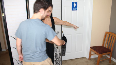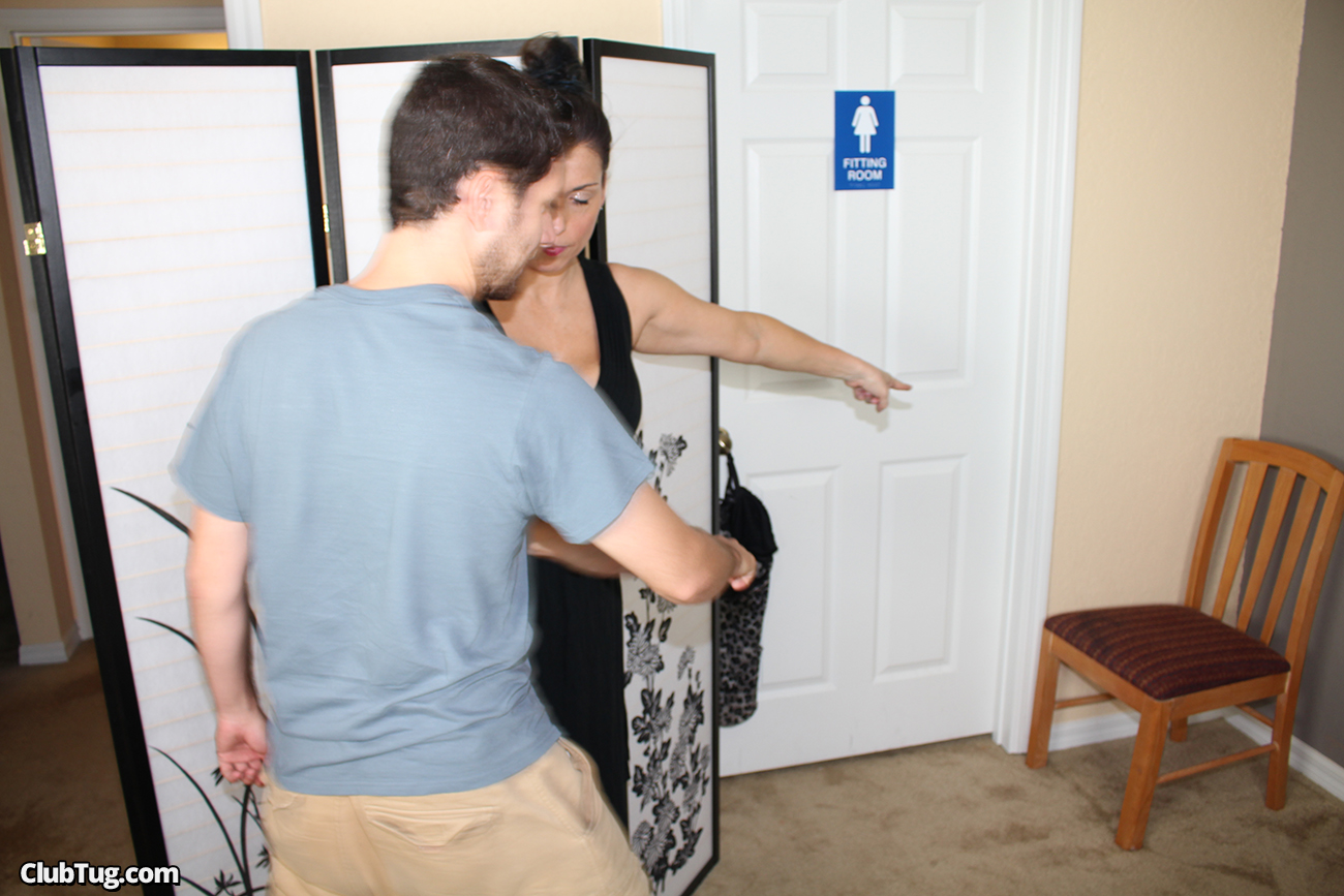 Hot Mom Stacie likes to take her step son Dan shopping but when she tries on a sexy new outfit he gets aroused in the fitting room. His cock is rock hard and Stacie decides to mils him dry right there in the fitting room.