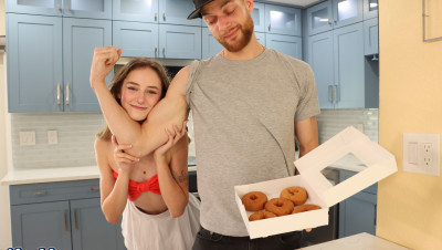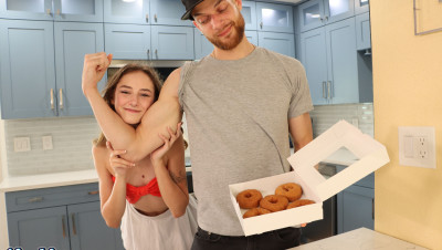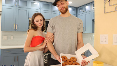 On his food cheat day, Cali decides to order some donuts. He wants 2 chocolate dipped, 2 birthday cake, and 2 glazed. When the order is delivered, he notices one of the glazed donuts is missing the actual glazing. After bringing it to her attention, Daisy Fox finds a fun and creative way to decorate the plain donut with his very own special cum glazing.