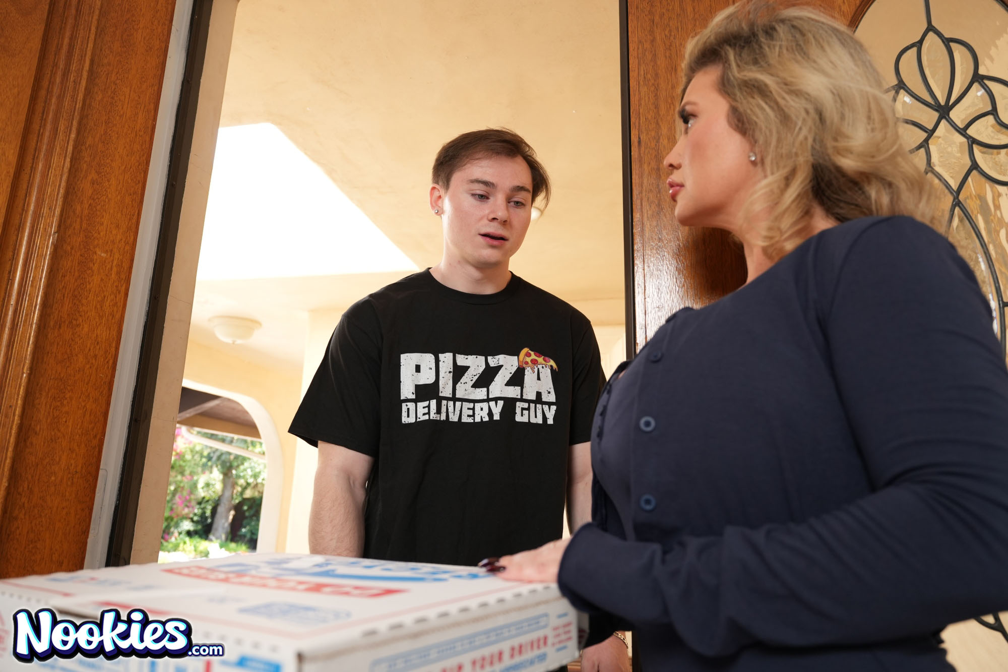 Anthony arrives at Andie Anderson's door with a late pizza, and she rips into him, furious at the lousy service. But her anger quickly flips when she notices the bulge in his pants, and the tension between them explodes into raw lust. She drags him inside, and the scolding turns into a rough, wet, no-holds-barred fuck right on her bedroom floor and blows his load accross her amazing tits and face.