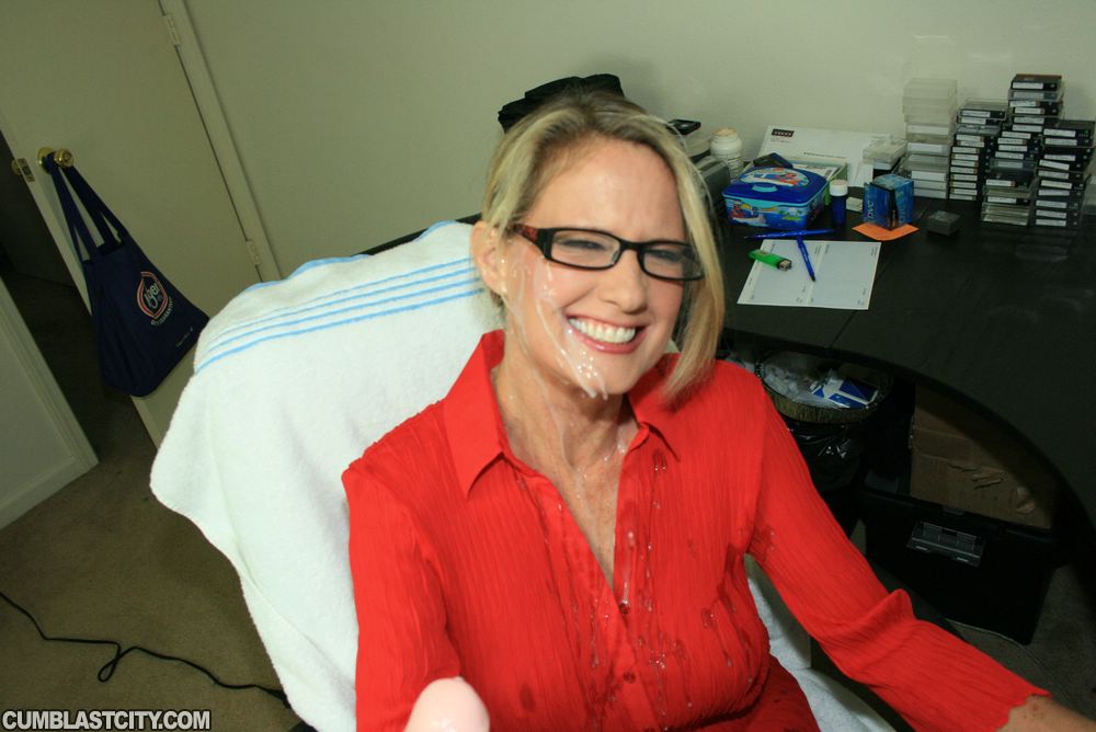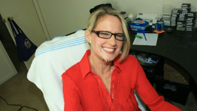 Mrs. Lee is working on her computer when Billy comes over and starts jacking off in front of her while she is working. She tells him to go away, byt Billy continues to jack his cock. While she is typing, he explodes buckets of cum all over the hot milfs face. "OK are you happy now Billy?!"