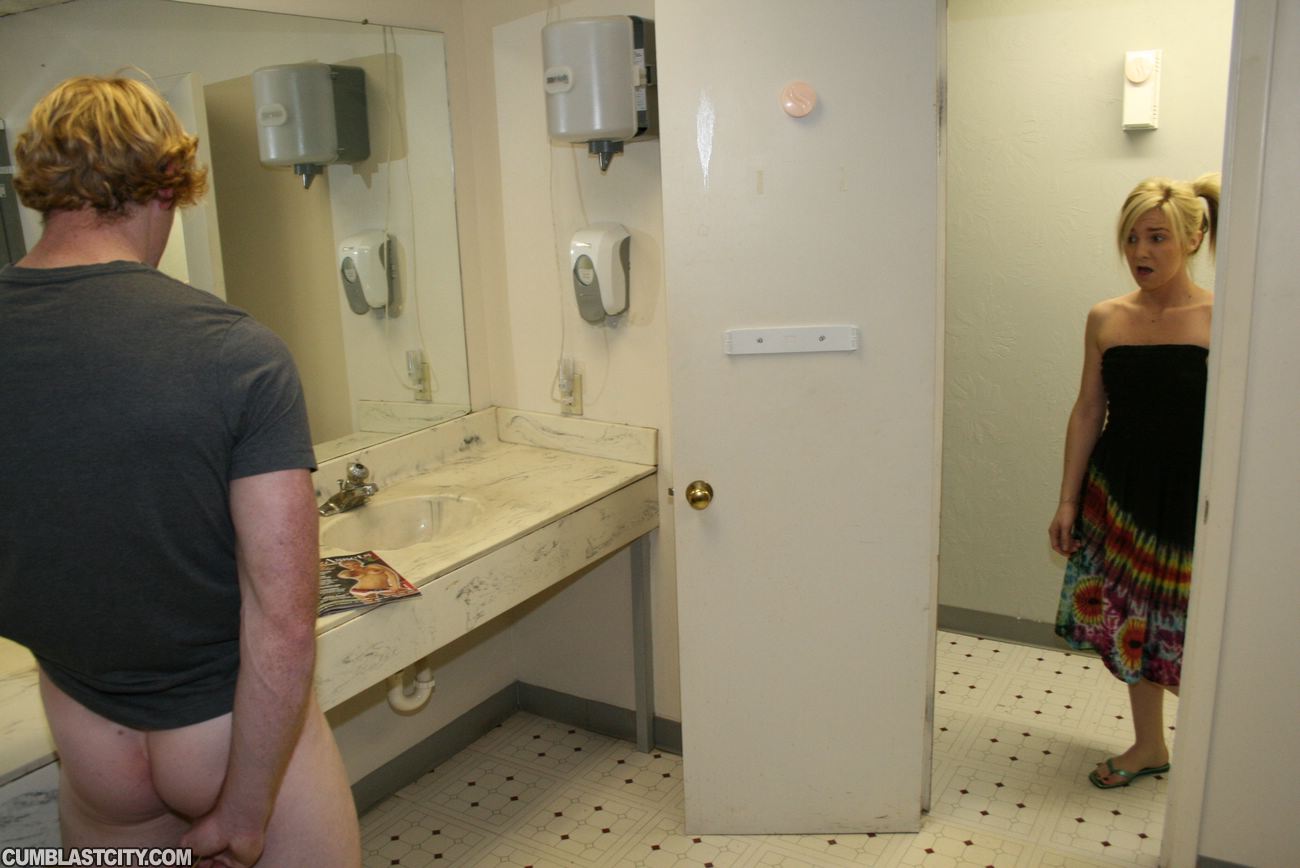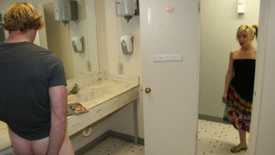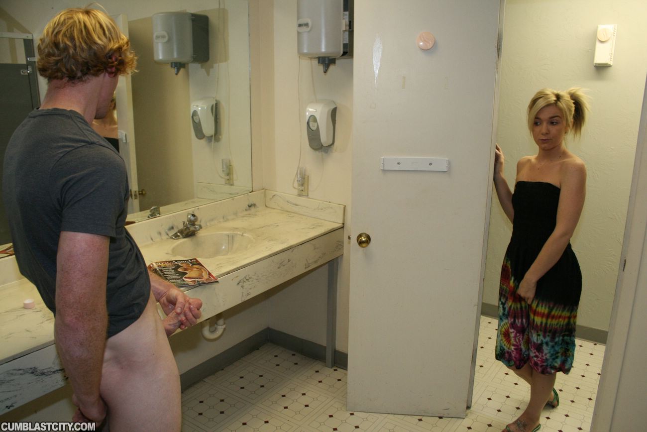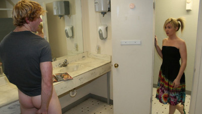 Teen Ericka catches William pulling his pud in a storage room. The shocked teen likes when she sees him jacking off his massive cock. Ericka reluctantly joins in and starts milking his cock when she is splattered with salty goo.