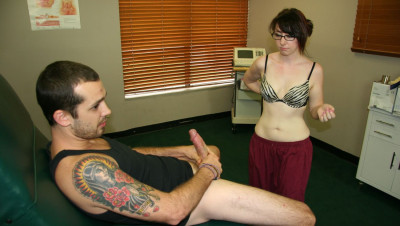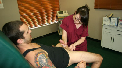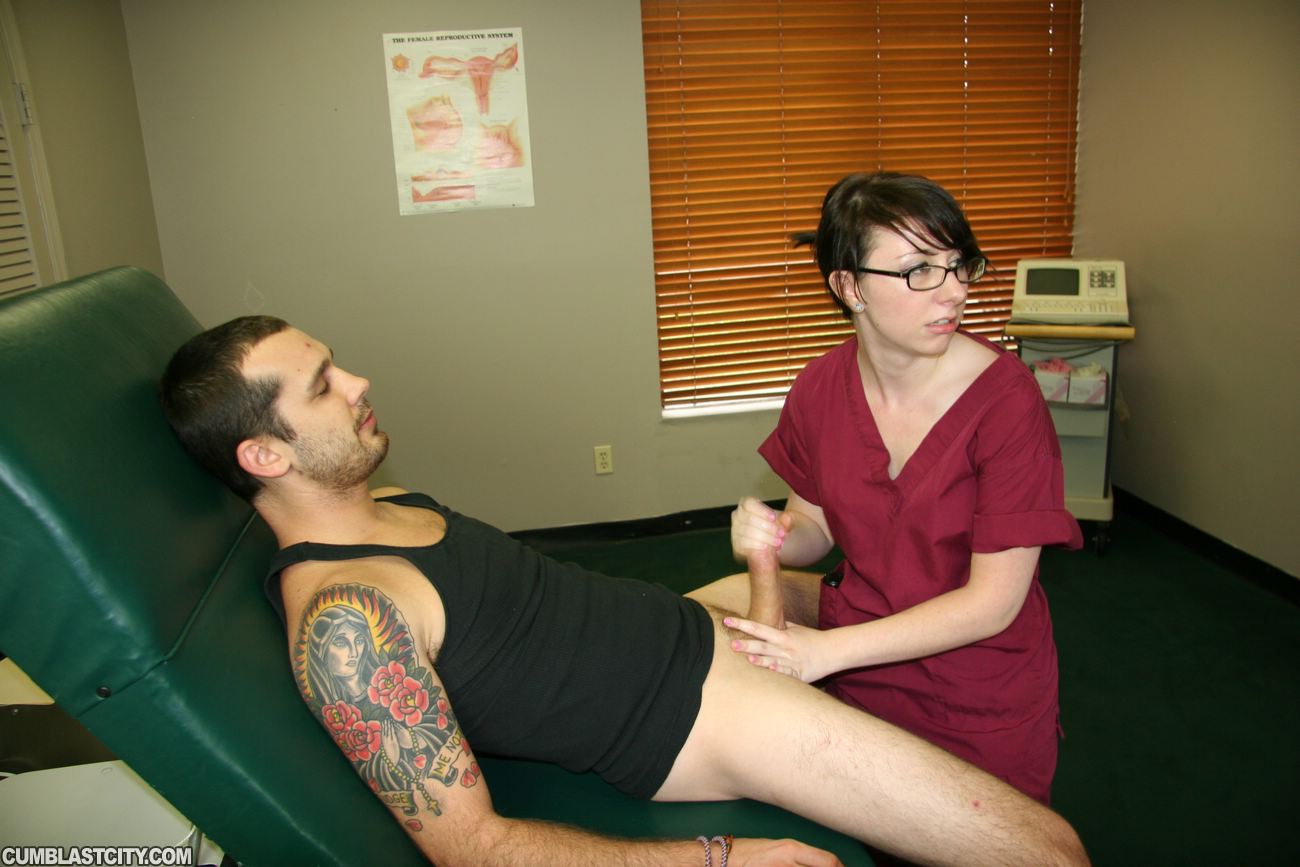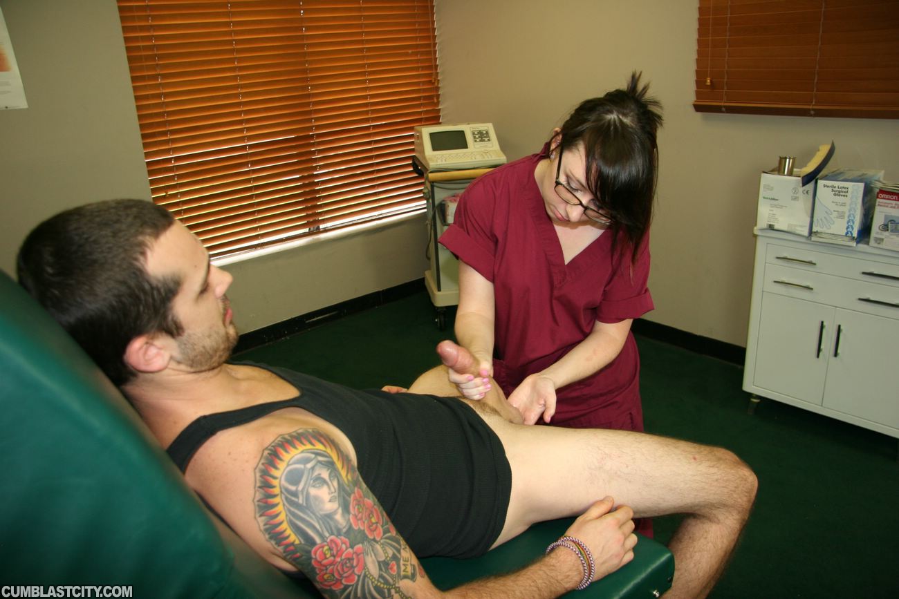 When Billy goes to see the nurse about his bum leg, he also tells nurse Dakota about his ejaculation problem. He can cum a lot more than most guys. Dakota is in shock, and curious. She closes the door behind her and starts jerking his throbbing dick to see for herself.