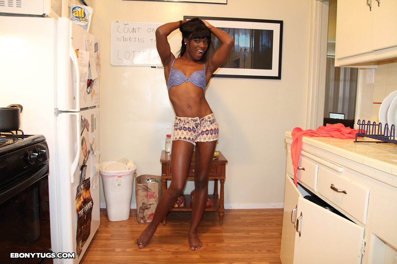Billy visits sexy ebony Ana Foxx while she is washing the dishes at home. The hot babe is always happy to give him a handjob, so she stops washing and gets naked. Ana sits on her knees while jerking Billy's cock, asking for a facial cumshot. Billy does never say "no" to a sexy lady, so he explodes his cum in her face.