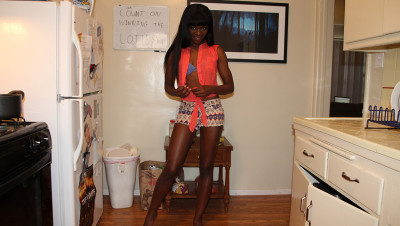 Billy visits sexy ebony Ana Foxx while she is washing the dishes at home. The hot babe is always happy to give him a handjob, so she stops washing and gets naked. Ana sits on her knees while jerking Billy's cock, asking for a facial cumshot. Billy does never say "no" to a sexy lady, so he explodes his cum in her face.