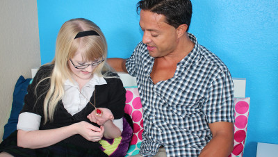 Krystal Orchid comes across a mystery necklace and as soon as she tries it on, her hormones start dancing out of control. Suddenly the once calm teen is horny as hell and ready for a rumble in the sack so she slides her fingers into her panties and starts rubbing her clit to get herself off but thankfully she doesn't have to settle for self-loving because her hung step dad steps in and offers up his big dick which the blonde teen greedily slurps up and then bends over.